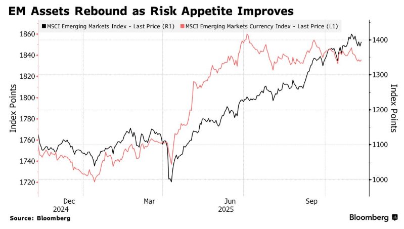週一,衡量新興市場股票市場的「MSCI新興市場指數」一度上漲近2%,其他統計機構一項追蹤新興市場大中盤股價回報的基準指數也錄得類似漲幅。MSCI所彙編的一項衡量新興經濟體貨幣的基準指數則上漲了約0.5%,亞洲地區的新興市場貨幣領升該匯市指數。