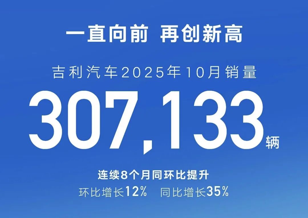 排名第二名的是吉利汽車,10月銷量同比增長36.8%至26.6萬輛,是排行榜中同比漲幅最高的車企,市場份額為11.8%,與排名第一的比亞迪汽車僅相差3萬輛。作為傳統車企向智能新能源轉型的代表,吉利新能源轉型已初見成效,尤其是在吉利銀河系列的強勁發力背景下,吉利在新能源汽車的銷量佔比持續攀升,並推動了吉利汽車的銷量增長。截至目前,吉利銀河旗下已佈局E5、E8、L6、L7、吉利星願、星艦7 EM-i、銀河星耀8、銀河A7、銀河M9等車型,產品覆蓋各大細分市場,且新車上市速度極快。