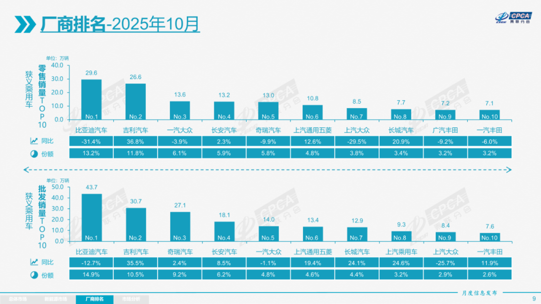 依據乘聯分會公佈的國內車企零售銷量排行榜來看,10月零售銷量排名前十的廠商分別為比亞迪汽車、吉利汽車、一汽大衆、長安汽車、奇瑞汽車、上汽通用五菱、上汽大衆、長城汽車、廣汽豐田、一汽豐田。其中,比亞迪跌幅最大,同比下滑31.4%,月銷量29.6萬輛,而吉利汽車漲幅最大,同比增長36.8%,銷量僅次於比亞迪,為26.6萬輛。進入2025年以來,吉利汽車憑藉銀河品牌持續增長,而比亞迪雖然仍然為國內最大汽車廠商,但近幾個月來銷量出現連續下滑,10月銷量不足30萬輛,吉利汽車有反超比亞迪的跡象,如果接下來幾個月維持目前的市場趨勢來看。其它品牌來看,長安汽車同比增長2.3%,奇瑞汽車同比下滑9.9%,長城汽車同比增長20.9%。