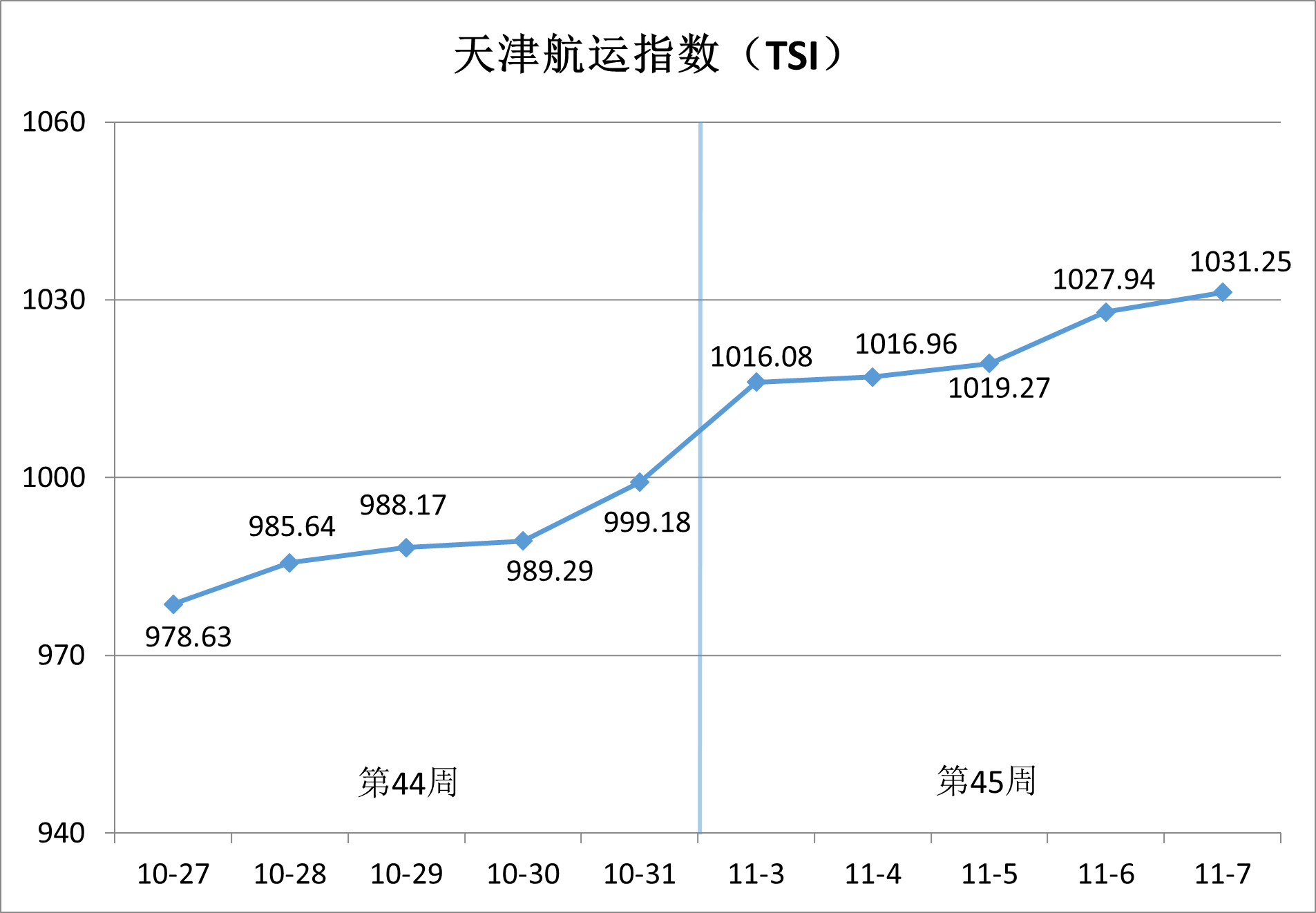 新華財經天津11月10日電(記者李亭)記者從天津國際貿易與航運服務中心獲悉,2025年第45周(11月3日-7日),中國北方內外貿海運價格的風向標——天津航運指數進一步上漲,最終收於1031.25點,相比10月31日(第44周最後一個發佈日)累計上漲32.07點,累計漲幅3.21%。
