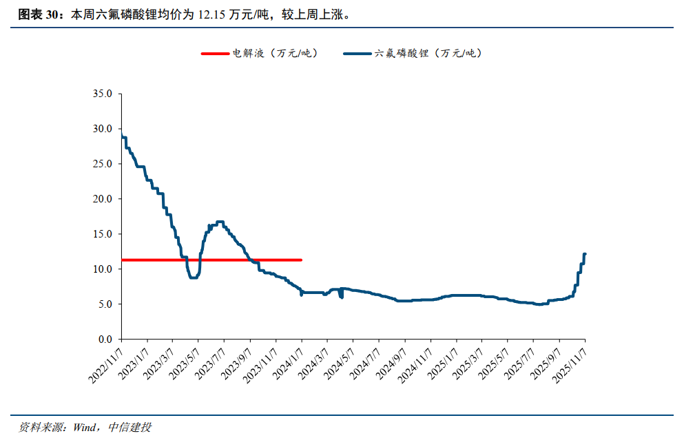 鋰電:26年需求30%以上增速下會催生材料當前啓動漲價,市場對供需扭轉逐步認知,後續關注:①排產旺季材料和儲能電池供不應求價格不斷提升;②伴隨着11月/12月下游採購和長單指引,26年需求越發明朗;③定價模式發生變化;繼續看好材料尤其是6F、VC等價格漲幅迅猛的環節,鐵鋰、負極、隔膜、鋁箔的龍頭機會。