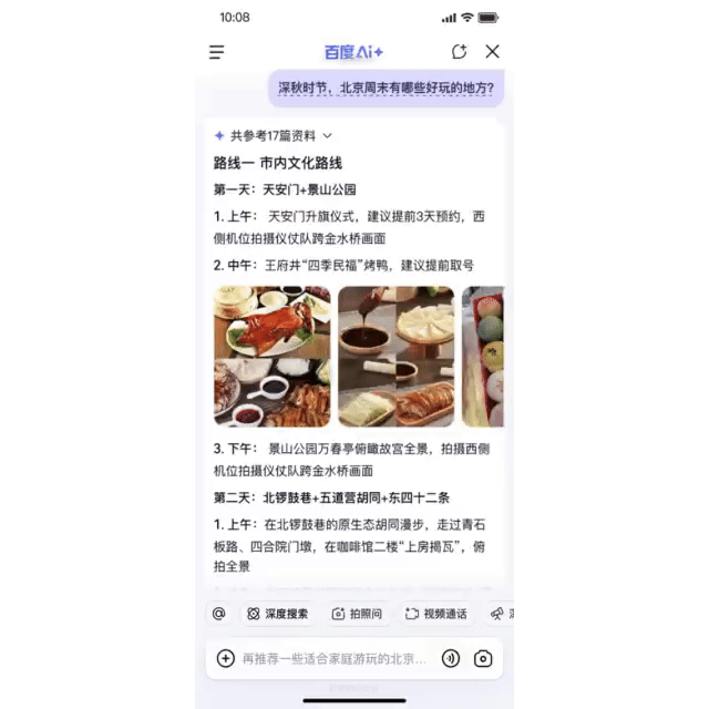 舉個栗子:一名遊客來到北京,用百度搜索「深秋時節,北京週末有哪些好玩的地方?」傳統搜索會展現一系列信息;而大模型會將檢索到的文章進行智能總結,哪些公園適合賞秋、哪些衚衕藏着小衆玩法、哪些近郊能避開人流,一目瞭然。同時優質的圖片、視頻等多媒體內容也在結果中呈現,讓遊客感受更加深刻。