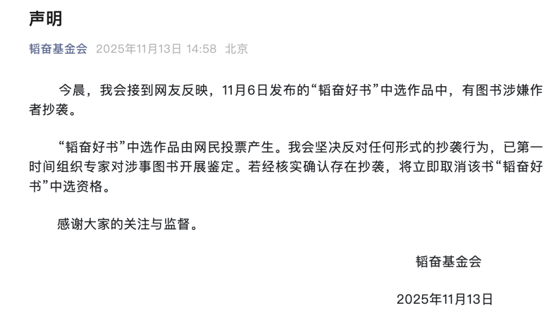 11月13日,韜奮基金會發布聲明:今晨接到網友反映,11月6日發佈的「韜奮好書」中選作品中,有圖書涉嫌作者抄襲。「韜奮好書」中選作品由網民投票產生。基金會堅決反對任何形式的抄襲行為,已第一時間組織專家對涉事圖書開展鑑定。若經覈實確認存在抄襲,將立即取消該書「韜奮好書」中選資格。