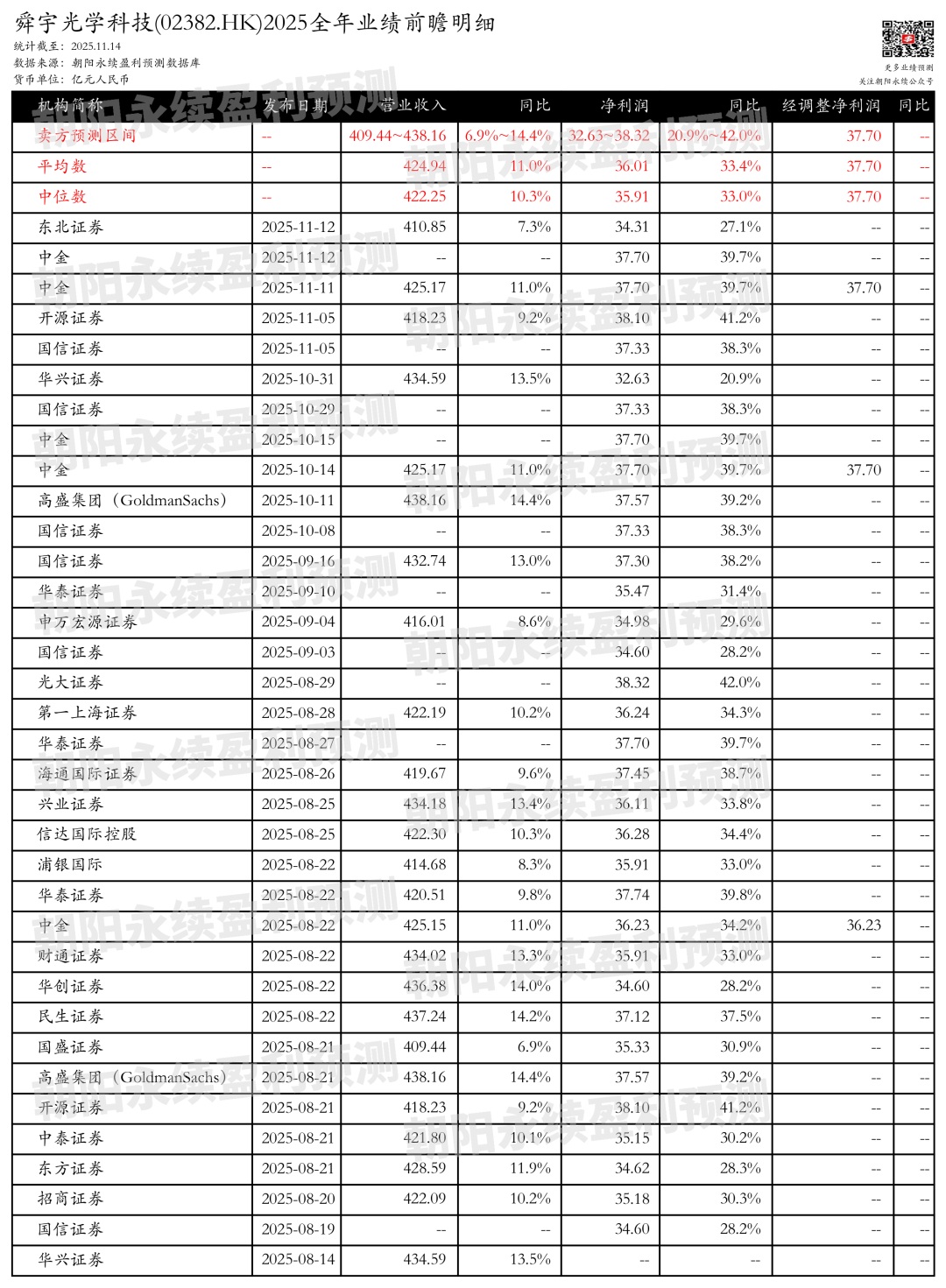 截至2025年11月14日,根據朝陽永續季度業績前瞻數據: