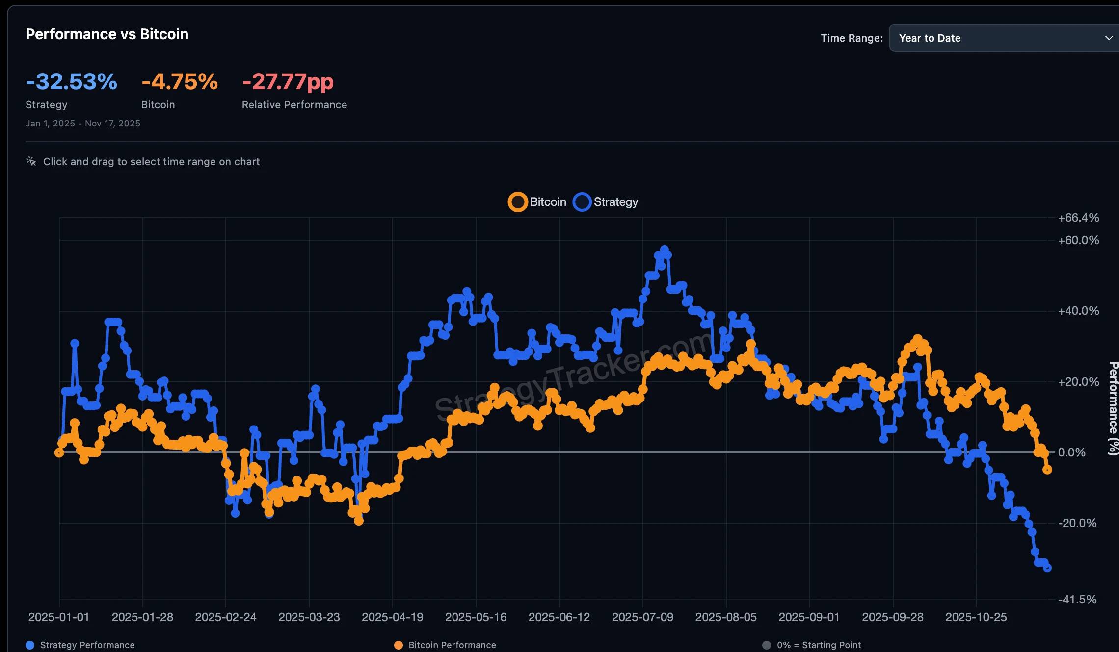 從今年年初算的話,BTC 只跌了 4.75%,但 MSTR 股價已經跌了 32.53%。
