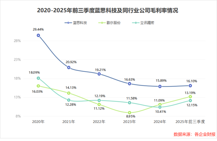 另一方面,客戶集中易導致公司議價能力受限。2025年前三季度,藍思科技與立訊精密、歌爾股份的毛利率均未超過20%。