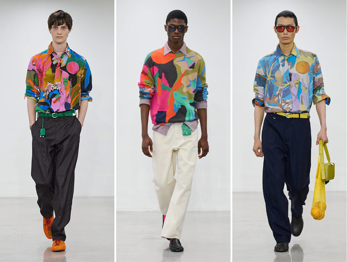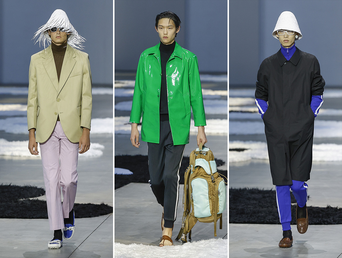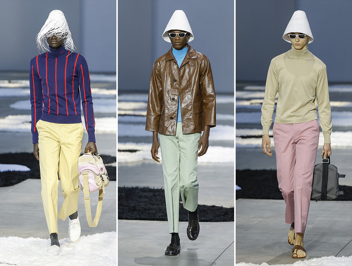 本季,普拉達打造了一個富有色彩張力的男裝系列,既有大膽而清爽的糖果色,如蘋果綠、金絲雀黃、西瓜紅、綠松石藍,也有嬰兒粉、水綠、天空藍等柔和輕盈的顏色。在這場名為「調性更迭」的時裝大秀中,繽紛色彩象徵自由與不羈,寓意一種靈活的心理狀態,以此引領男士們擺脫束縛,步入充滿嶄新律動的新世界。