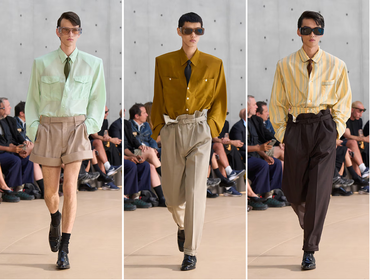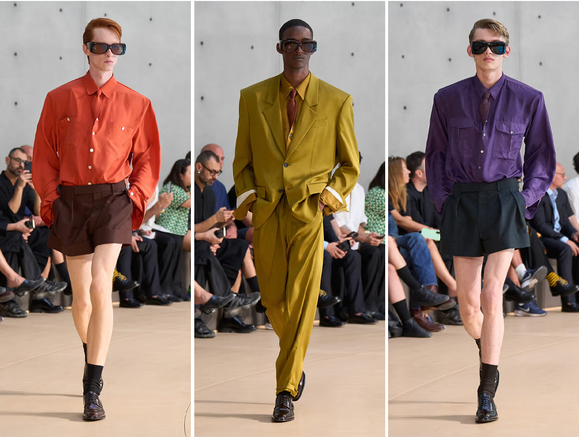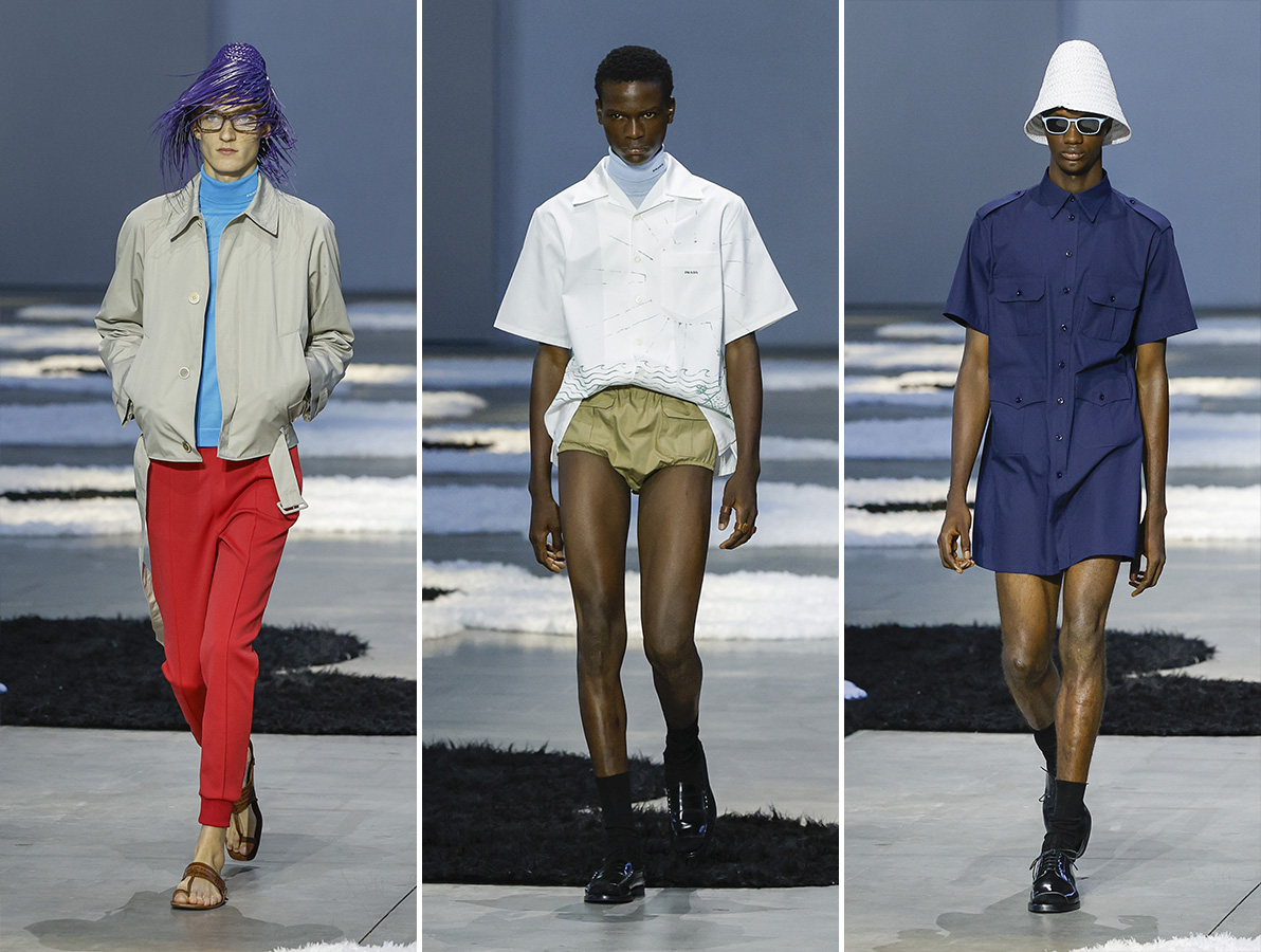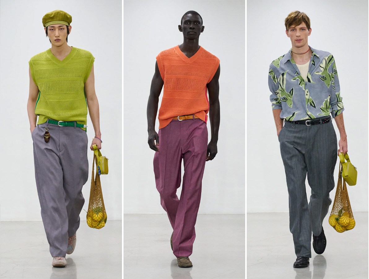 本季,普拉達打造了一個富有色彩張力的男裝系列,既有大膽而清爽的糖果色,如蘋果綠、金絲雀黃、西瓜紅、綠松石藍,也有嬰兒粉、水綠、天空藍等柔和輕盈的顏色。在這場名為「調性更迭」的時裝大秀中,繽紛色彩象徵自由與不羈,寓意一種靈活的心理狀態,以此引領男士們擺脫束縛,步入充滿嶄新律動的新世界。