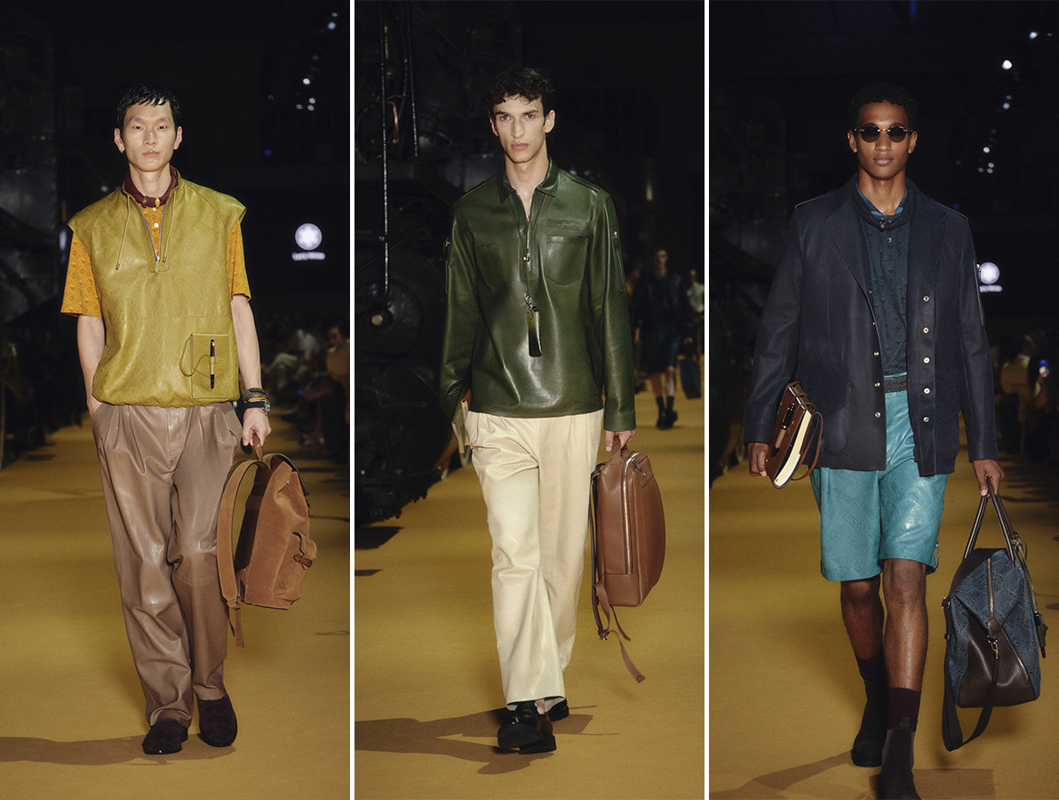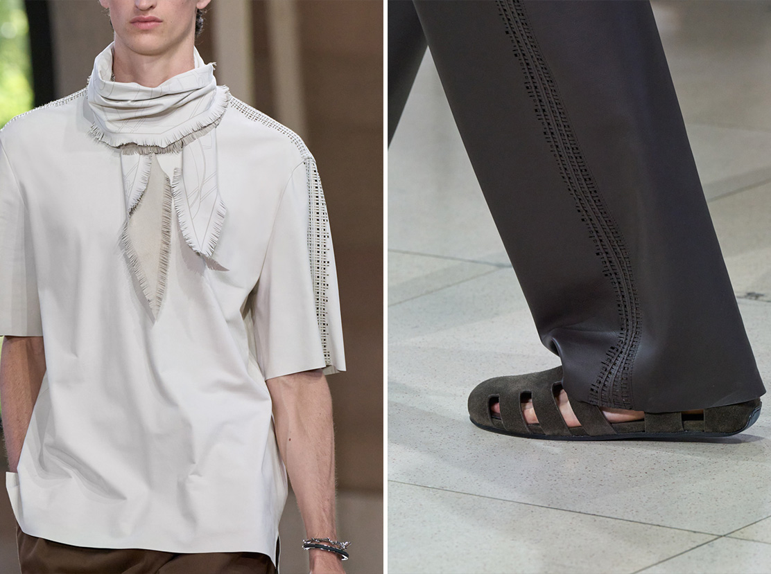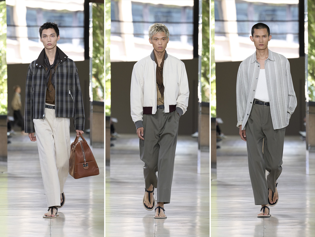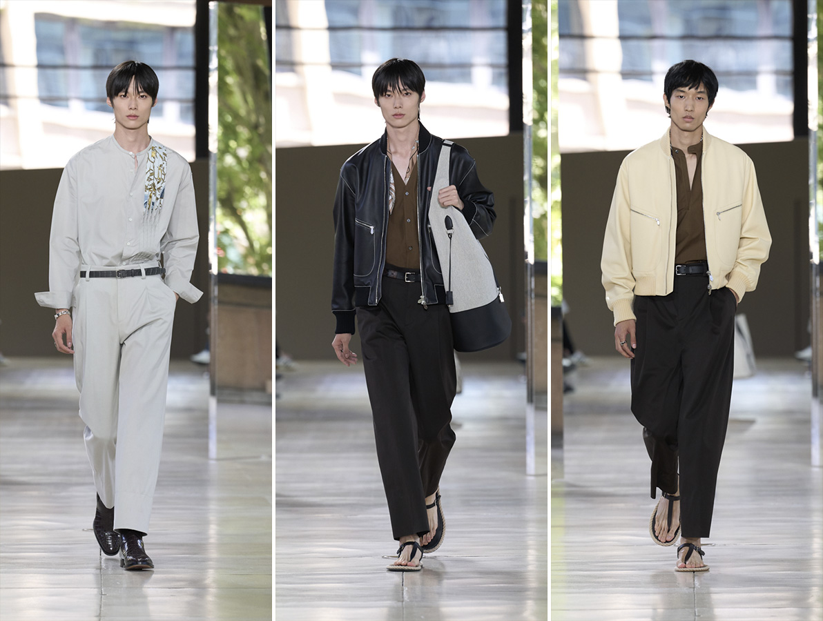 愛馬仕(Hermes)本季男裝追求一種輕盈自在感,無論從材質工藝還是廓形比例上,為低調隨性的優雅男士打造現代都市衣櫥。寬鬆褲裝搭配短身夾克的組合比例恰到好處,舒適而不慵懶。而皮革這一品牌標誌性元素在設計巧思和精湛工藝的配合間多了一份「呼吸感」——飛行員夾克、T恤和長褲等皮革單品融入鏤空編織處理。本系列主要以牛皮紙色、石灰泥色、咖啡色、淡灰褐色等中性色為主,勃艮第紅、香草色與薄荷綠色點睛其中。
