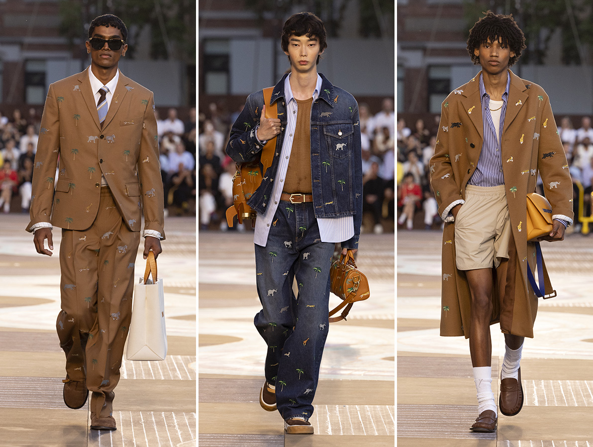 路易威登(Louis Vuitton)男裝創意總監法瑞爾·威廉姆斯(Pharrell Williams)則將視角轉向印度現代精裁風格及其對全球當代衣櫥的影響。本季靈感部分來自2007年上映的經典電影《穿越大吉嶺》,路易威登當年專為其設計了別緻圖案——生活於各大洲的動植物交織為整體紋樣,出現在片中11件行李箱上。如今,這一圖案首次融入品牌系列,以刺繡形式躍現於條紋襯衫及短褲、丹寧套裝、格紋正裝等單品上。威廉姆斯表示,「我們是時尚品牌,也是一家植根於旅行文化的品牌。」這組圖案不僅延續了路易威登的品牌基因,也鼓勵當代男性以探索者的姿態面對世界。