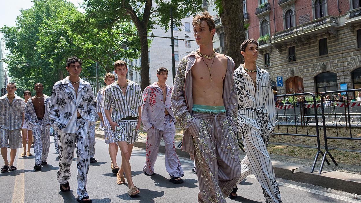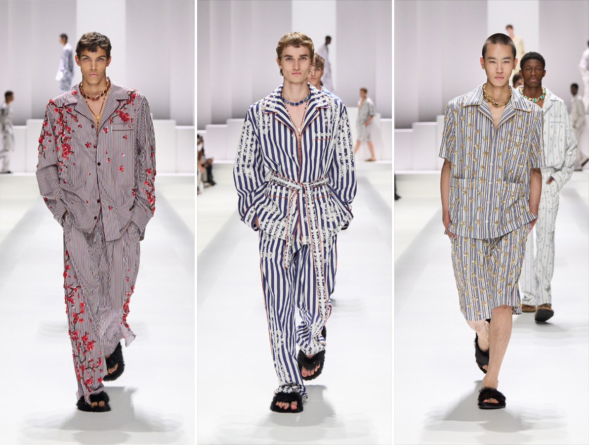 杜嘉班納(Dolce & Gabbana)本季圍繞「PYJAMA BOYS」主題,演繹了一場睡衣美學的風格革新,展現當代男性的鬆弛與自信。本系列作品將都市格調與度假風情着裝巧妙融合,其中品牌標誌性單品睡衣煥發新意,雅緻色調與鮮明撞色和諧碰撞,輕盈棉質提花面料綴飾粗細各異的豎條紋圖案,部分更有手工鑲嵌的璀璨寶石及水晶刺繡織,讓睡衣化身為華美且風格多元的新表達。