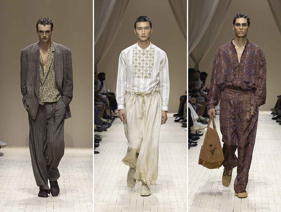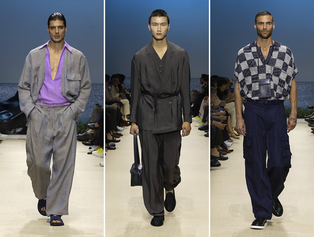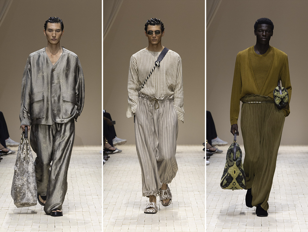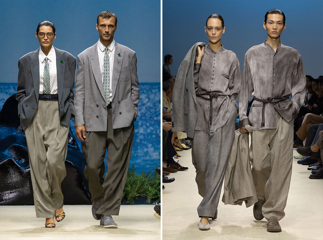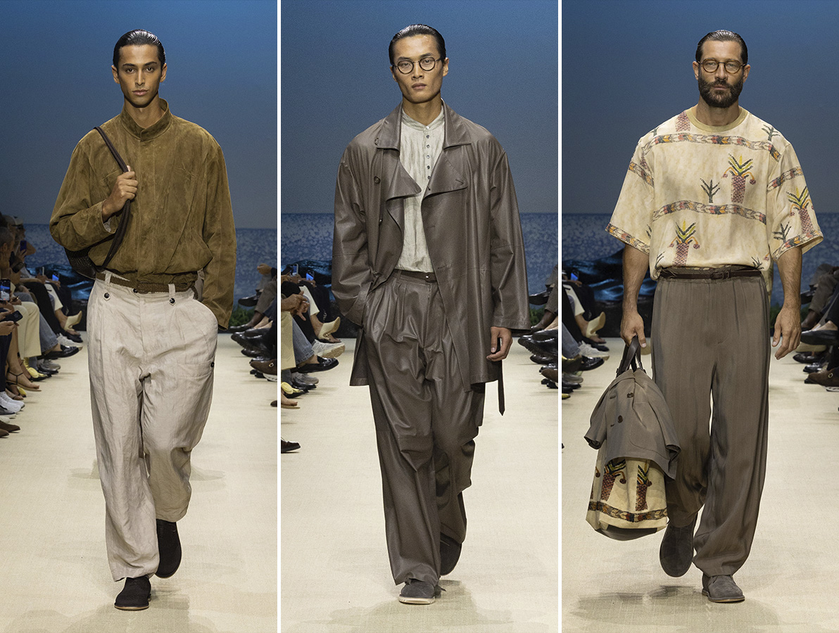 與此同時,Emporio Armani則從「本源」出發,這一季系列迴歸喬治·阿瑪尼先生的美學原點:對多元文化的尊重,以及對通過日常穿着、用不同方式表達自我的探索。他從非洲文化中汲取符號、色彩和理念,將其轉化為Armani標誌性的輕盈與流暢形態,包括一系列柔軟西裝、寬鬆長褲和飄逸長衫。對本源的思考始於材質,如縐綢和亞麻或粗糲挺括、或流暢輕盈,又如冷染技術所賦予色彩的古樸質感。