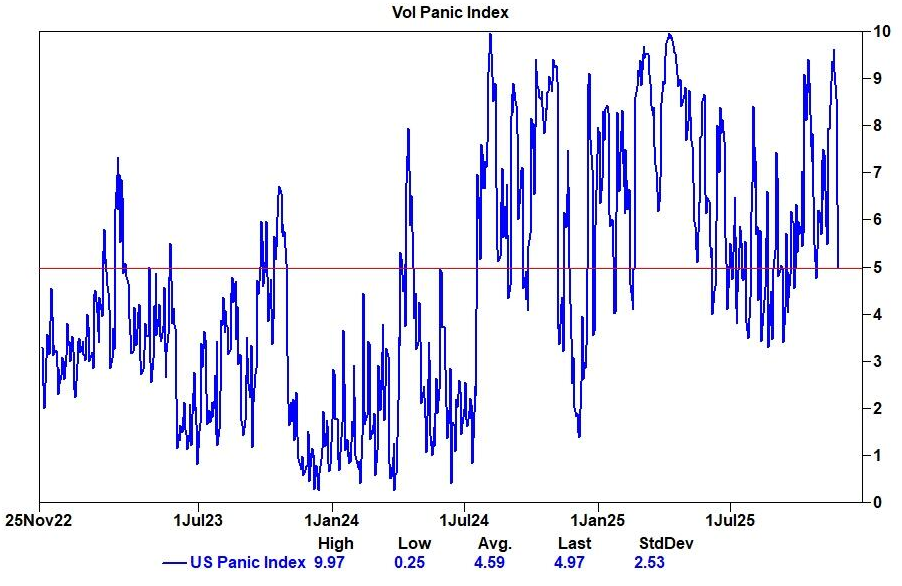 波動率恐慌情緒冷卻: 高盛的「波動率恐慌指數」(Vol Panic Index)已從本月高點回落至5,略高於其3年期平均值4.6。構成該指數的引申波幅、波動率的波動率(vol-of-vol)和期權偏度等多個分項指標均已同步降溫。