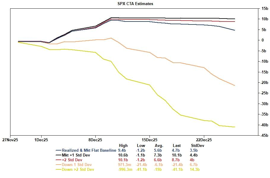 首先,系統性資金的去風險過程已基本完成。高盛估計,在過去一個月中,系統性策略基金在標普500指數上進行了約160億美元的賣出。展望未來,下一個月的基準情景已轉變為溫和買入(約47億美元),這使得由系統性資金引發的強制性拋售尾部風險已「顯著下降」。