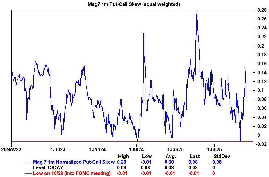 大型科技股倉位迴歸中性: 此前,市場對七大科技巨頭(Mag 7)的看漲情緒極度擁擠,其期權市場的看漲/看跌期權偏度(put-call skew)甚至出現倒掛(看漲期權價格高於看跌期權)。這種極端看漲的倉位在上週被迅速扭轉,目前已迴歸中性水平。