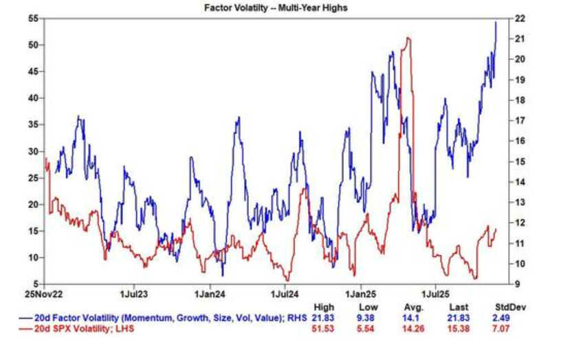 數據顯示,20天因子波動率已升至20以上,而標普500指數的波動率僅溫和上行。這意味着,那些在特月供資風格上押下重注的投資組合(如成長股 vs 價值股,或AI贏家 vs 其他股票),其波動遠大於市場整體表現。