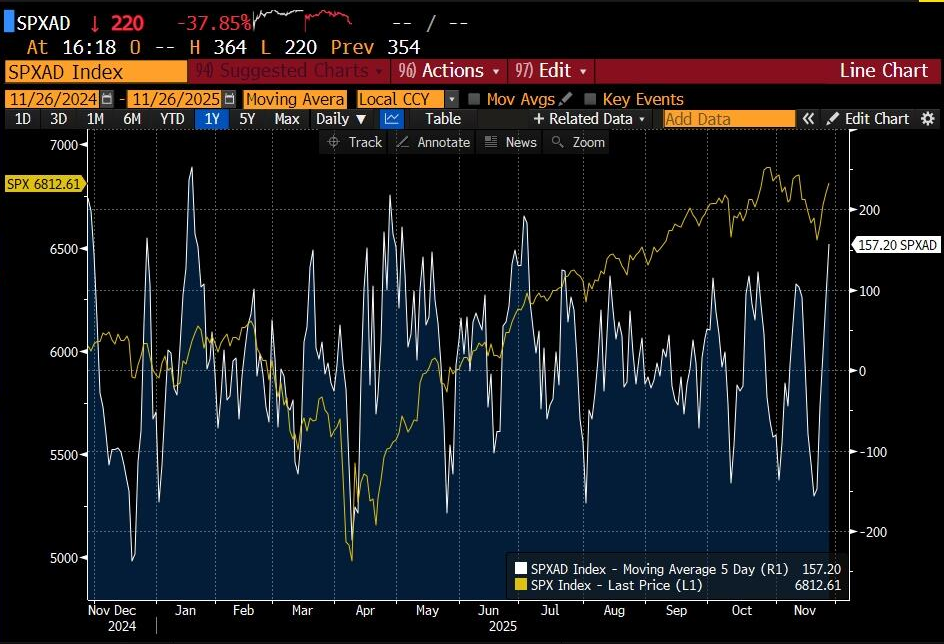 市場廣度顯著改善: 市場上漲的參與度正在擴大。衡量市場廣度的標普500上漲/下跌股票數量5日移動平均線,已從11月早些時候的-150(代表盤面下存在嚴重損傷)強勁反彈至+150區域。這表明上漲不再侷限於少數股票,而是更廣泛的參與。