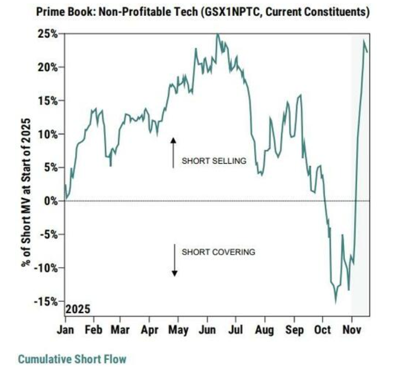 據高盛頂級交易員Shawn Tuteja觀察,在進入11月前,市場普遍對年底行情抱有極高期望,甚至一些長期看空的投資者也轉為看多。然而,這種過度一致的看漲預期,疊加10月29日聯儲局鷹派立場的影響,引發了市場的劇烈調整。