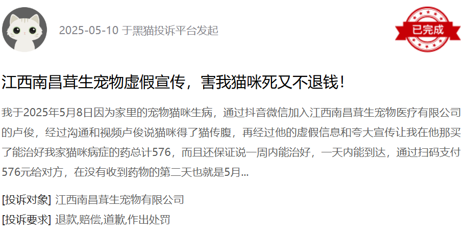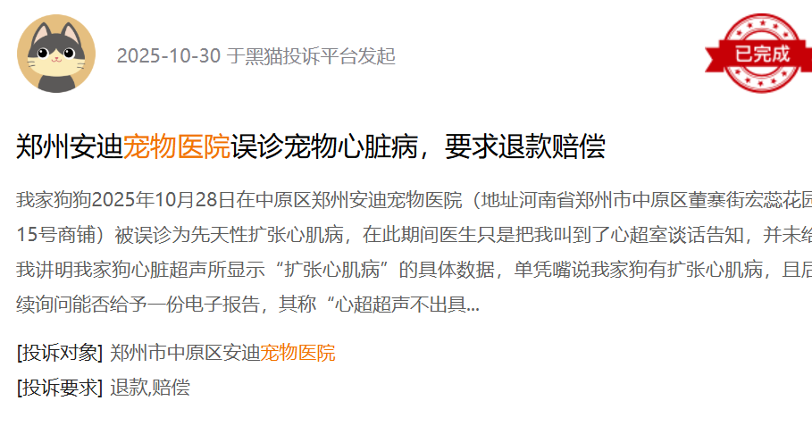 黑貓投訴平台消費者投訴截圖面對強勢的醫院,很多主人覺得維權太難就放棄了。其實,只要抓住「證據」和「知情權」這兩點,普通消費者完全可以贏!10月30日,有消費者在黑貓投訴 【下載黑貓投訴客戶端】平台發起投訴,控訴鄭州安迪寵物醫院誤診寵物心臟病,要求退款賠償。據消費者描述,自家狗狗在就診時被醫生誤診為先天性擴張心肌病。最離譜的是,醫生只是把主人叫到談話室口頭告知,沒有講解具體的數據。「空口判病」的行為讓消費者非常氣憤。投訴後,消費者堅持要求醫院給出說法。最終,在黑貓平台的介入下,消費者最終訴求得到了妥善解決。