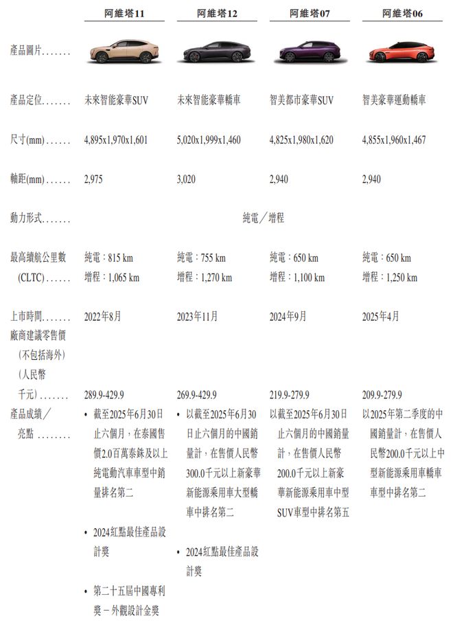 截至最後實際可行日期,阿維塔已推出四款主要量產車型,即阿維塔06、07、11及12。就阿維塔11及12而言,公司亦推出了皇家劇院系列及限量版「0」系列,即阿維塔011及阿維塔012。