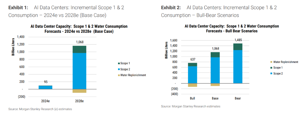 數據中心是極其依賴物理資源的實體,摩根士丹利的模型顯示,AI數據中心的「乾渴」程度正在以驚人的速度增長。