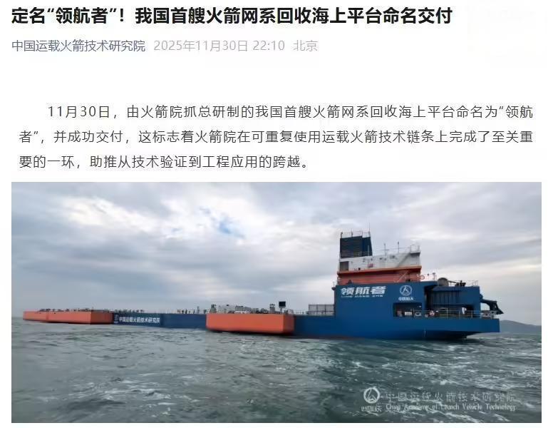 IT之家 12 月 1 日消息,據中國運載火箭技術研究院分享,11 月 30 日,由該院抓總研製的我國首艘火箭網系回收海上平臺命名為「領航者」,併成功交付。這標誌着火箭院在可重複使用運載火箭技術鏈條上完成了至關重要的一環,助推從技術驗證到工程應用的跨越。