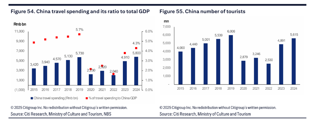 旅遊行業:報告指出,中國旅遊需求持續堅韌。2024年旅遊支出佔GDP的比例為4.3%,仍低於2019年疫情前的5.7%,顯示出進一步的增長潛力。同時,國際航班客運量已在2025年第三季度恢復至疫情前水平。