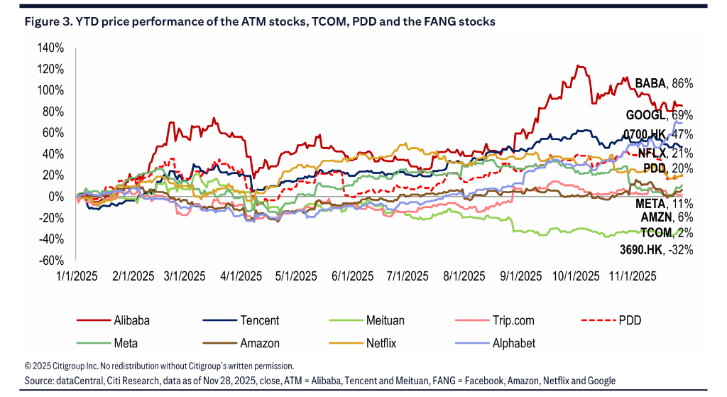 與此同時,AI帶來的生產力提升將釋放更多休閒娛樂需求,利好遊戲和旅遊等具有穩定盈利能力的行業。花旗認為,由於地緣政治風險和AI供應鏈限制,中國互聯網公司的估值可能將繼續低於全球同行。