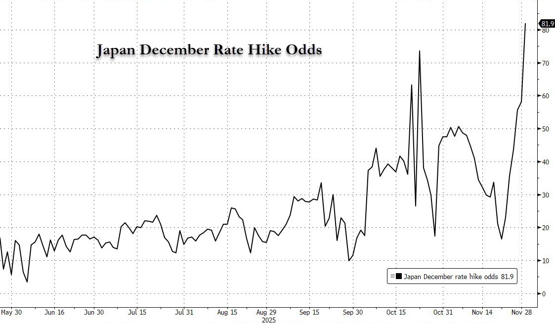 植田和男一番講話後,市場對日本央行12月加息的預期從20%激增到了 80%。市場擔憂,在年底流動性枯竭的背景下,日本央行若在聖誕節前夕意外加息,可能引發類似2022年12月的市場劇震,重演「套息交易屠殺」。目前,華爾街陷入分歧,大摩認為12月加息已是基準情形,但高盛認為概率雖上升,但更有可能在1月。