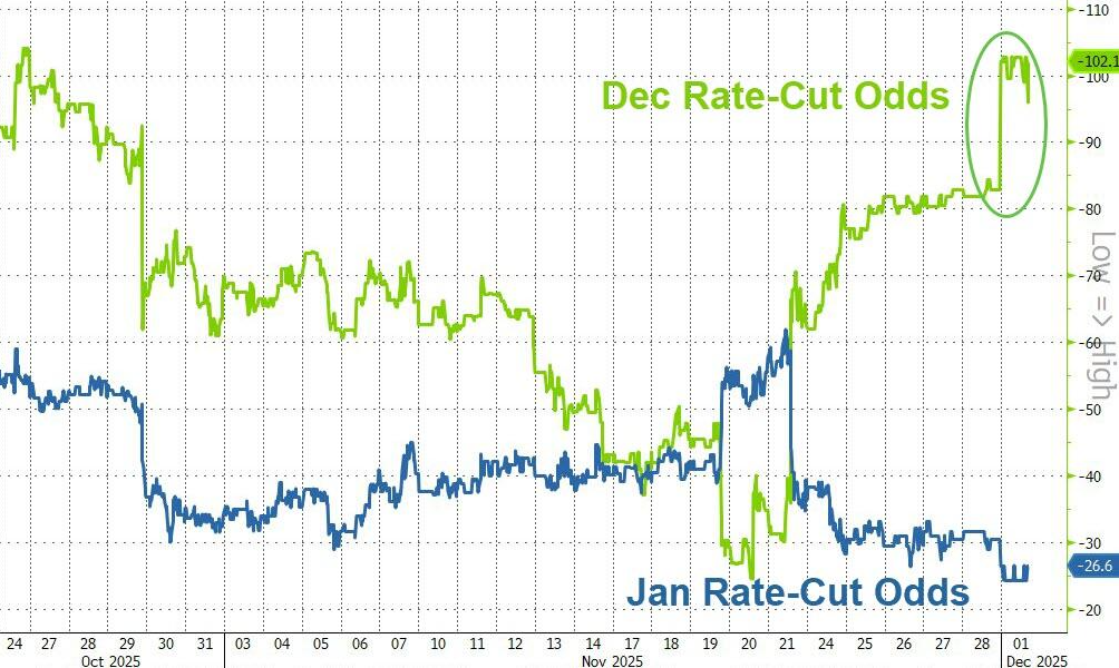 市場反應立竿見影,市場對日本央行12月加息的可能性定價從十天前的20%激增到了 80%。此前,聯儲局的溝通混亂一度將12 月降息的可能性從80%降低到30%,之後又提高到了100%。