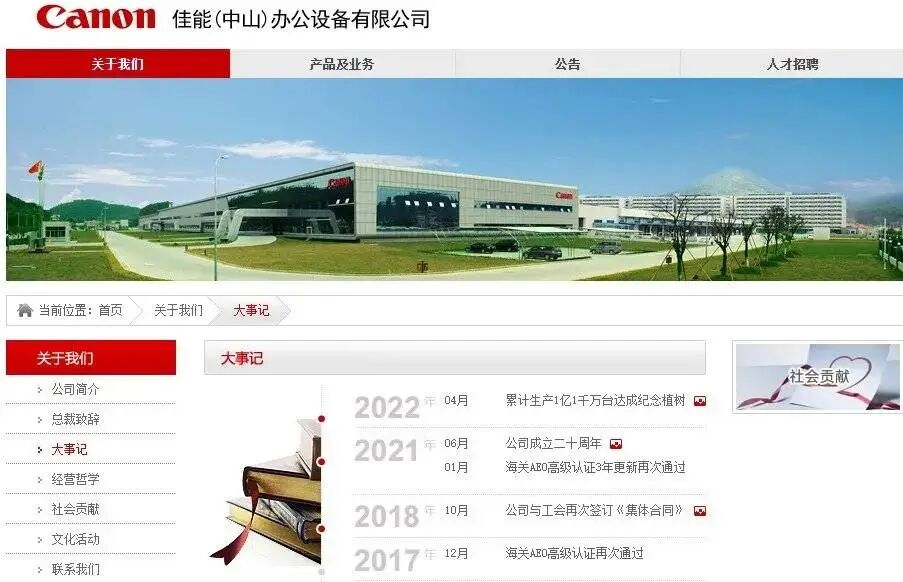 在佳能(中山)辦公設備有限公司官網上,公司大事記還記錄着2022年「累計生產1億1000萬臺」的字眼。2022年之後,大事記就再也沒有更新過。