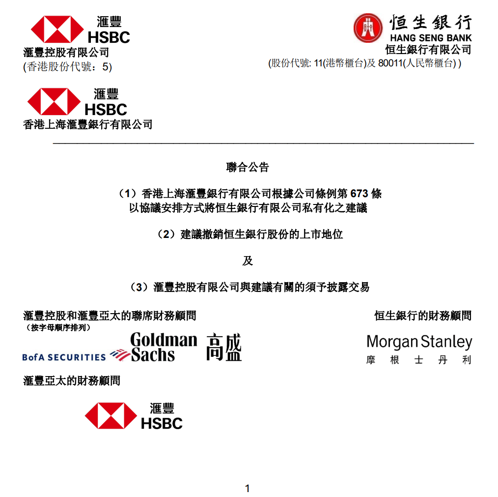 而今年10月,滙豐控股及恒生銀行聯合發佈重磅公告,宣佈滙豐亞太將以每股155港元的價格私有化恒生銀行,交易總額達1061.56億港元。這一價格較恒生銀行消息公佈前的收盤價119港元溢價約30.3%。以恒生銀行全部已發行股本計算,此次交易估值達2903.05億港元,滙豐亞太需支付約1061.56億港元現金收購其尚未持有的36.5%股權。