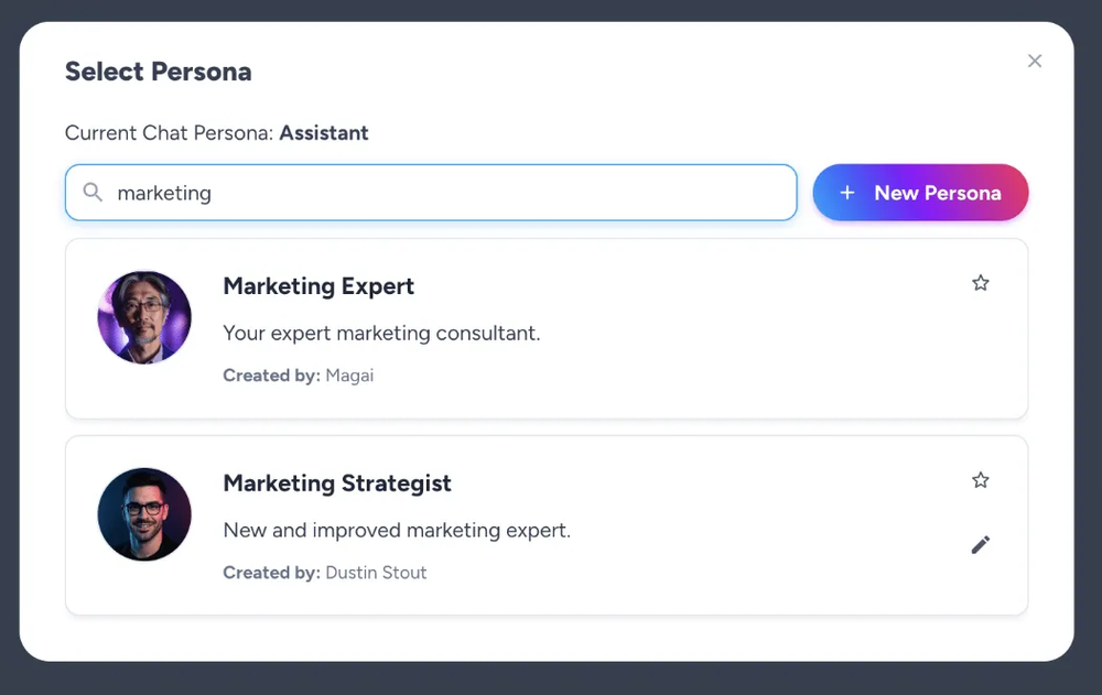 Dustin 憑藉多年的營銷背景,發現許多用戶並不知道如何編寫高質量的提示詞(Prompt)。為了降低使用門檻,Magai 引入了「Persona」(人格)系統。