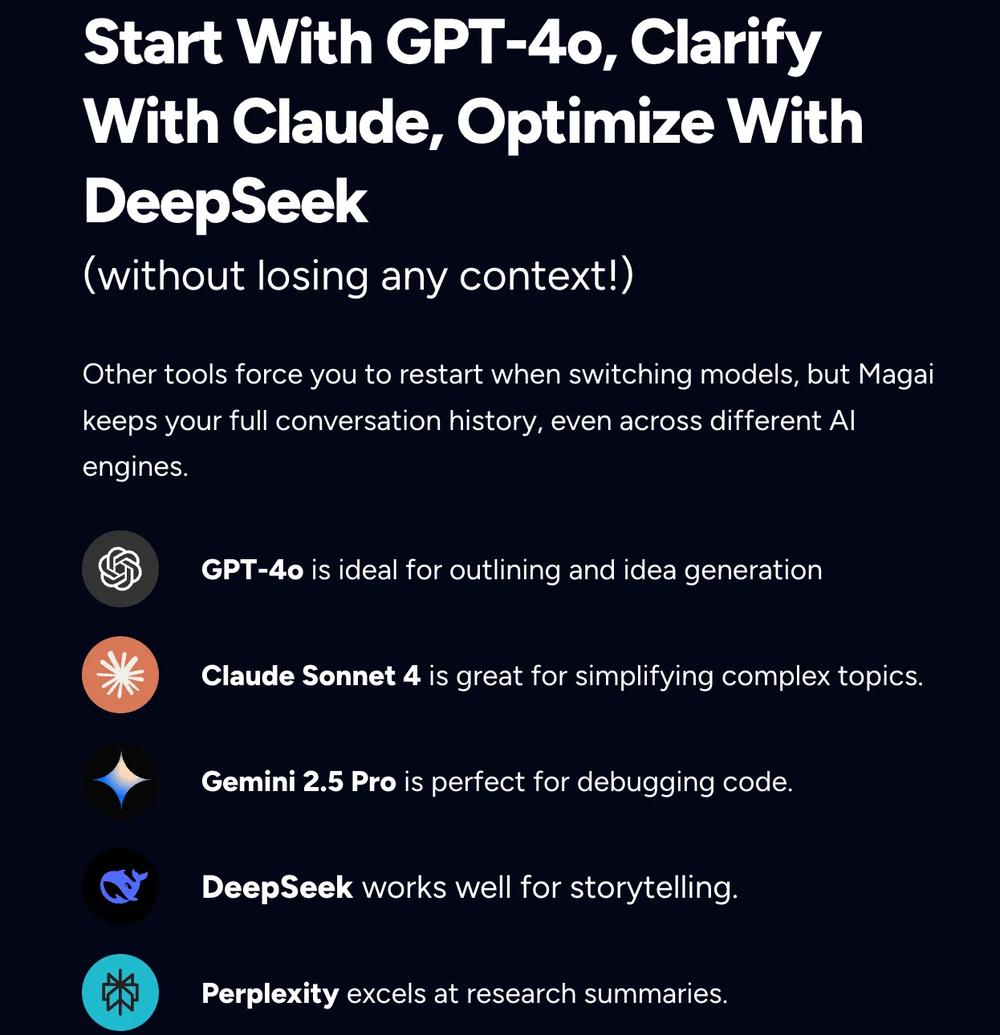 在當下的多模型競速時代,Magai 代表的是一種越來越清晰的趨勢:把 GPT、Claude、Gemini、LLaMA、DeepSeek 等模型統一收納到一個工作臺裏,讓用戶不再需要在多個網站、多個賬號之間來回切換。