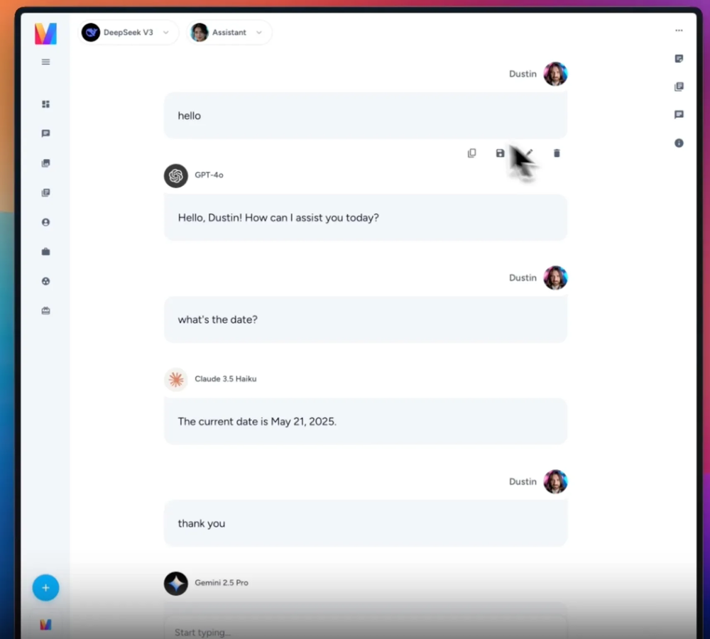 在 Magai 平臺上,用戶不需要為了使用不同的模型而登入不同的網站。Magai 將 GPT、Claude、Gemini、Mistral 以及圖像生成模型全部整合在一個統一的聊天界面中,在同一個對話線程中,用戶可以隨意切換使用的模型,而無需重新開始對話。
