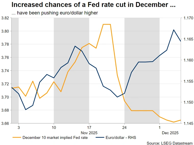 聯儲局與澳洲聯儲政策立場的分化,一直推動澳元兌美元升向0.6610區域。若下週這一政策分化得到確認,且鮑威爾暗示2026年1月降息,則澳元可能進一步升向 0.6680 區域。但若布洛克等人的措辭更為中性,則匯價可能回落至0.6550附近。