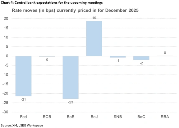 FX168財經報社(亞太)訊 本週在聯儲局降息預期的支撐下,風險偏好上升,美元持續走弱。展望下週,市場重點關注聯儲局利率決議,市場已經為此提前佈局,重點關注點陣圖和整體會議措辭。此外,澳洲聯儲、加拿大央行和瑞士央行也將召開會議,但出現意外的可能性相對較低。黃金原油則關注俄烏局勢,和平協議仍然難以達成。