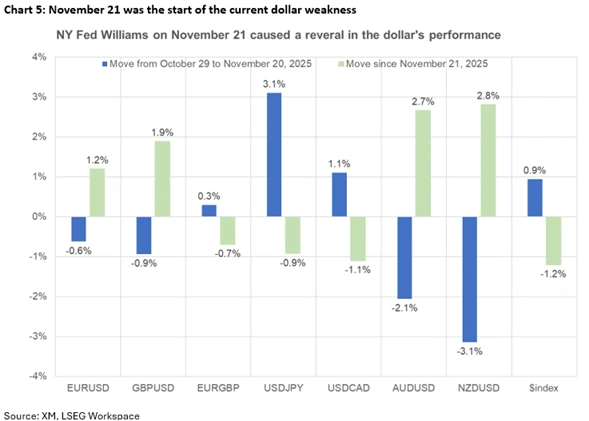 激進鷹派的聯儲局官員講話、10 月會議紀要顯示對再度降息存在強烈阻力,以及政府關門導致數據缺失,使得11月降息看起來幾乎不可能。然而,一切在11月21日紐約聯儲主席威廉姆斯的言論後發生了變化,加上11月公佈的有限數據——特別是週三疲弱的 ADP 報告——使得降息概率飆升至 86%。
