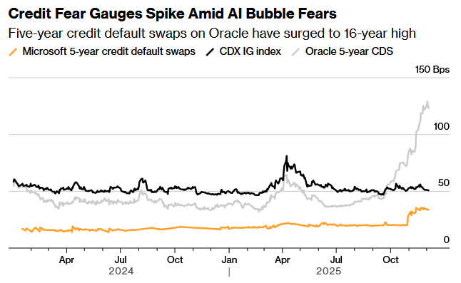 除了甲骨文之外,其他違約互換的價格也在攀升。上周四,一份保護微軟1000萬美元債務免於違約的五年期信用違約互換年化成本約為3.4萬美元(即34個點子),高於10月中旬的近2萬美元。