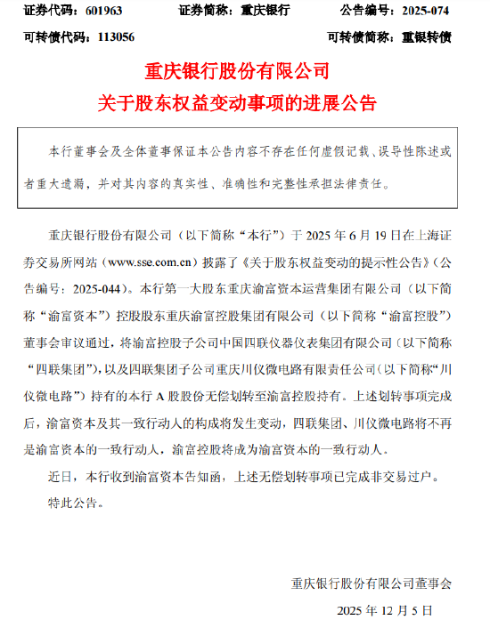 12月5日金融一線消息,重慶銀行發佈公告稱,該行於 2025 年 6 月 19 日在上海證券交易所網站披露了《關於股東權益變動的提示性公告》。第一大股東重慶渝富資本運營集團有限公司(以下簡稱「渝富資本」)控股股東重慶渝富控股集團有限公司(以下簡稱「渝富控股」)董事會審議通過,將渝富控股子公司中國四聯儀器儀表集團有限公司(以下簡稱「四聯集團」),以及四聯集團子公司重慶川儀微電路有限責任公司(以下簡稱「川儀微電路」)持有的重慶銀行A 股股份無償劃轉至渝富控股持有。上述劃轉事項完成後,渝富資本及其一致行動人的構成將發生變動,四聯集團、川儀微電路將不再是渝富資本的一致行動人,渝富控股將成為渝富資本的一致行動人。