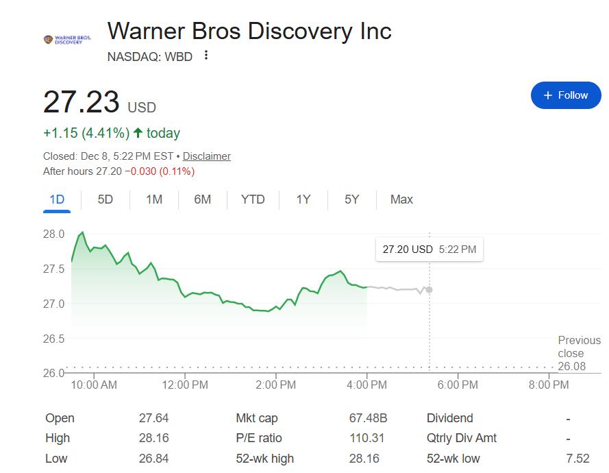 競購戰升級之際,12月8日週一,華納兄弟和派拉蒙股價雙雙大漲,前者早盤刷新日高時漲近8%,後者早盤漲幅曾達到10.4%。而奈飛進一步下跌,早盤刷新日低時跌近5%。到收盤,華納兄弟漲4.4%,派拉蒙漲約9%,奈飛跌約3.4%。