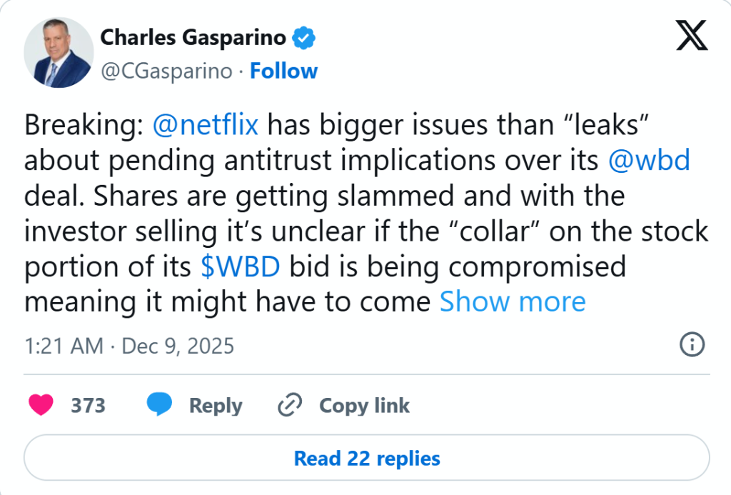 據福克斯商業記者Charles Gasparino分析,隨着Netflix股價遭重挫,其此前競購方案中股票部分的價值保護機制面臨失效風險,這意味着Netflix可能被迫籌集更多現金以維持交易吸引力。