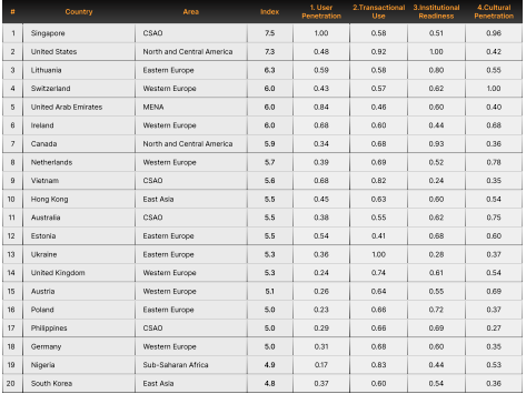 排行榜按照28個指數及91個基礎數據點,包括區塊鏈分析、平臺使用、政策數據庫和網絡流量指針等編制。以地區域分,9個區域中,北及中美排行第一;其次為西歐;至於新加坡所屬區域中亞、南亞和大洋洲則排行第四;香港所屬區域東亞排行第8。