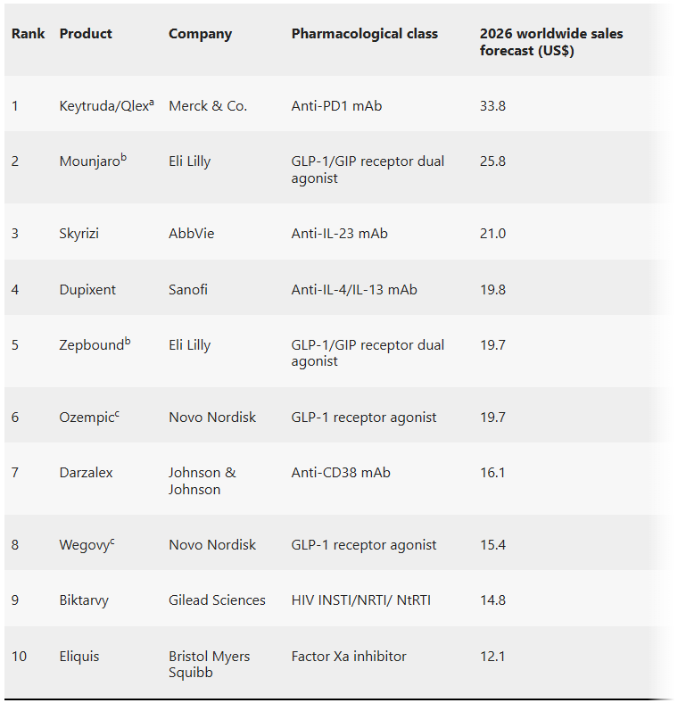 與去年對2025年的預測相比,2026年TOP10的產品名單並未發生變化,顯示出頭部陣營的穩定性。不過,產品內部的排名將出現顯著調整。值得關注的是,這十款藥物預計將在2026年創造總計1980億美元的銷售額,相較於2025年預測的1680億美元,增幅高達18%,增長勢頭強勁。
