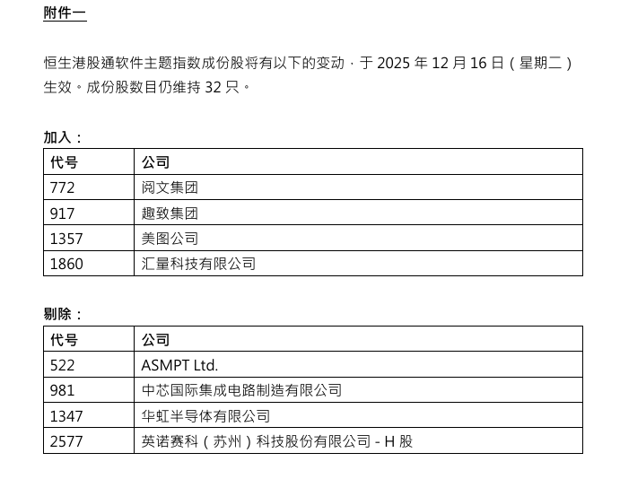 12月11日,恒生指數公司發佈通告,恒生港股通軟件及半導體指數將改名為恒生港股通軟件主題指數,編算方法亦將更新,成份股數目固定為40只。加入閱文集團、趣致集團、美圖、匯量科技四隻股份,剔除ASMPT、中芯國際、華虹半導體等幾隻股票,指數的重新命名及相關的成份股變動將於2025年12月16日生效。成份股數目仍維持32只。
