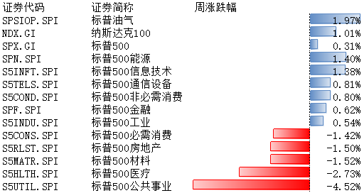 上週(12月1日-5日),標普油氣指數整週上漲1.97%,納斯達克100指數整週上漲1.01%,標普500指數整週上漲0.31%,其覆蓋的11個行業板塊有6個上漲,其中標普500能源領升1.40%,標普500公共事業領跌4.52%。