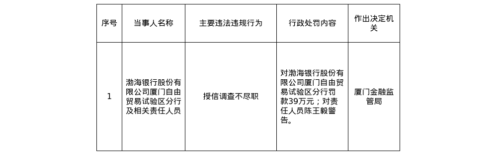 罰單顯示,渤海銀行股份有限公司廈門自由貿易試驗區分行的主要違法違規行為是:授信調查不盡職。