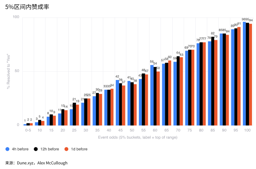 解讀並不複雜。例如,被定價在60%區間的事件,最終約有60%的概率以「是」收場;被定價在80%區間的事件,根據截止時間前剩餘小時數的不同,大約有77%–82%的概率最終實現。