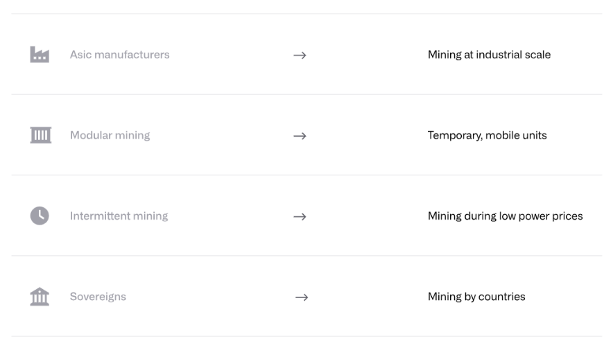 模塊化挖礦:一些公司正在提出一種模式,將臨時、可移動的挖礦模塊引入正在為其他用途開發的場地。一旦電力基礎設施到位,這些模塊即可接入並開始挖礦,並持續運行,直到電力外殼建設完成、場地正式對外出租。