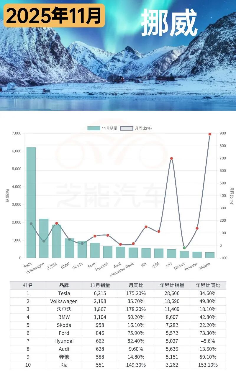 2025年11月的挪威汽車市場對任何關注新能源汽車的人而言,都值得細看。11月份,挪威新車銷量達到 19,899輛,同比猛增70.2%,是有記錄以來最強的11月。